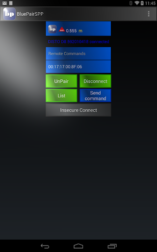 If your mobile phone doesn't support unclassified Bluetooth device discovery, then this software is for you. With BluePair SPP software installed, your phone shall be enabled to pair with these devices. eg.Disto D8 laser distance meter Software usage: App. will scan for BT device. Alternatively, MAC address can be entered in the Edit Box. MAC address is labelled on the device usually under the batteries.