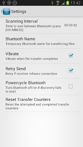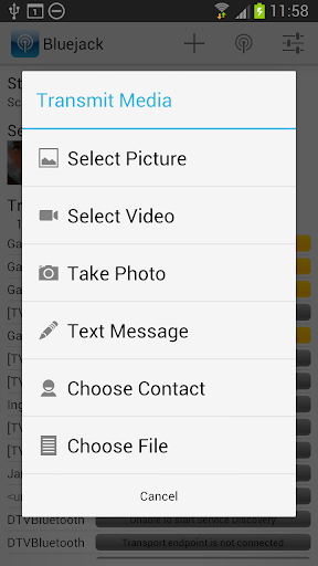 Note that iPhones doesn't support Bluetooth OBEX file transfer and some Androids will automatically reject unsolicited Bluetooth connections; these devices will be discovered by the app but will not be able to receive any files.