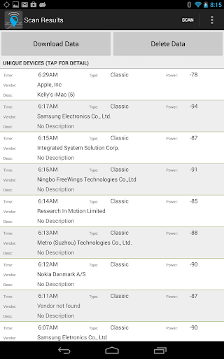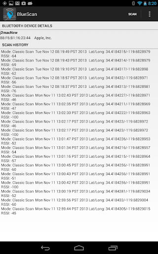 Bluetooth 4.0 (Low Energy and Classic Mode) Scanner. BlueScan scans for Bluetooth devices, looks up the vendor and allows you to email the results.The information is recorded includes: device name, location, RSSI signal strength, MAC address, MAC address vendor lookup.