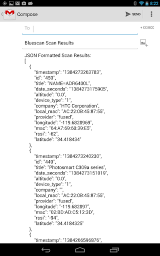 Scan data can be downloaded via email in JSON format. Also, this version uploads the found devices to a web database, which can be turned off in menu --> settings. Bluetooth 4.0 devices will be able to scan in Classic or Low Energy mode. Devices without Bluetooth 4.0 can scan in Classic mode only.