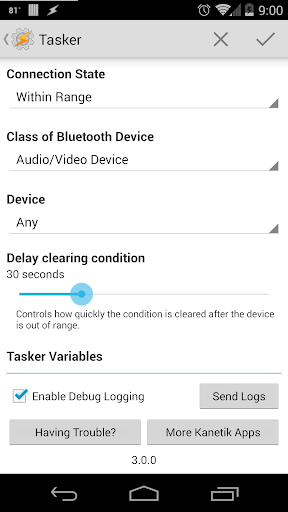 Tasker users might ask, "So what makes this different from the native functionality in Tasker?" The answer is mainly "ease of use" - not everyone wants to type in a MAC Address :). But there are also some features that I think are unique. Some examples: you can select class of device, so that (for instance) any A2DP connection triggers a task, or you can specify that you only care about a connection to your car's BT when it's the Hands-Free profile. You can also set a delay on unsetting the condition, and all of this is done in a very user-friendly interface. And you also get a local Tasker Variable with the name of the last connected device.
