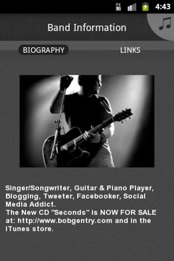 The official Bob Gentry iPhone App is now available! Stream Bob's music, watch videos, see pictures, read his blog and tweets and see when he's playing a show near you. Stay connected for the latest updates on Bob Gentry on your iPhone with our free iPhone App.