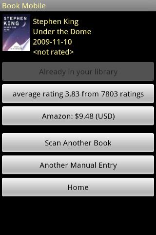 Catalog your personal library at home or in the store (not a book reader). Book Mobile will scan the ISBN barcode, look up the book in your google.books.com library. You can add it. You can read reviews & ratings, compare at Amazon, or follow the menu links to more information.