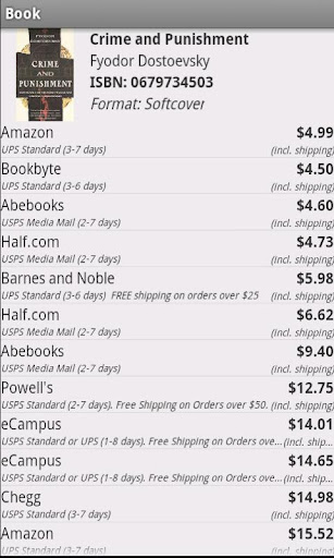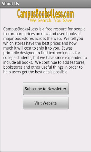 Have you ever been at Barnes and Noble or Borders and wondered if you could find the same book you wanted cheaper online? Have you ever wanted a single destination for all of your online book shopping? We at campusbooks4less.com have created a solution to meet these needs. Our BookSearch application enables users to search for online prices of books using an ISBN number, the book title, an author(s) or by keyword. For an individual book, we check how much it costs at many online bookstores and we present these results in a single easy to read table. Our application also allows you to purchase your book of interest from an online retailer directly on your phone. Don't overspend on a book again! The results we return include new, used, and rental books. Search for the cheapest price on a textbook or on any other book that interests you. Save money while at college or university by paying less for textbooks. Or save money by finding cheap prices on all books you enjoy.