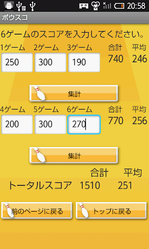 ボウリングスコアを3ゲームごと6ゲームごとに入力することで総スコア・平均スコアを計算できるアプリです。