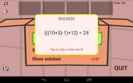 Box 24 is a single-player version of the "24 game", originally a card game from Shanghai. The goal is to combine four integers by adding, subtracting, multiplying, or dividing them (no remainders allowed) to reach a total of 24. The concept is simple, but victory can be a challenge for kids and grown-ups alike. It's a great way to practice your math facts, or to keep your brain fit!