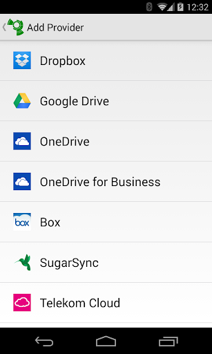 Dropbox, Google Drive, Microsoft OneDrive, Microsoft OneDrive for Business, Box, SugarSync, Telekom Cloud, Strato HiDrive, GMX MediaCenter, Web.de Smartdrive, mailbox.org Drive, Filespots, CloudMe, Grau DataSpace, Storegate, Egnyte, Cubby, PSMail Cabinet, Livedrive, Yandex Disk, CloudSafe and others using WebDAV. Additionally it is possible to encrypt files on your local device storage.