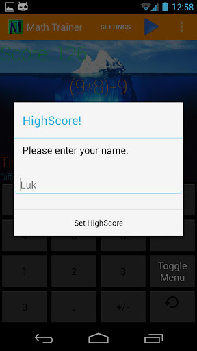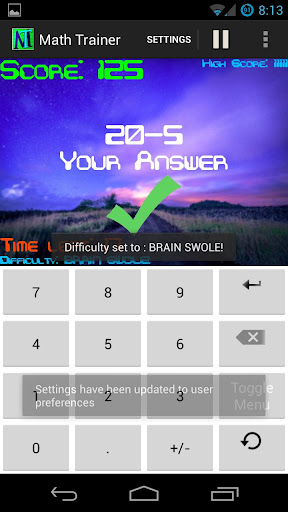 Math Trainer is a game that puts your mental math skills to the test. You score points based on the amount of time is left and gain levels as you accumulate points. High-scores are available and the app is very customizable. Text size, font, background, colors, keys; they can all be changed in the settings menu. Also, this app has a timer which can be paused if you get stuck or interrupted.