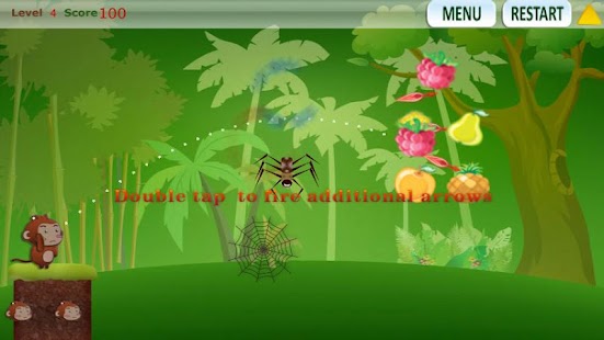 Fire arrow - tap the monkey and hold down. Pull the arrow toward the fruits you want to aim at. After the arrow is released, double tap anywhere on the screen to release additional arrows.
