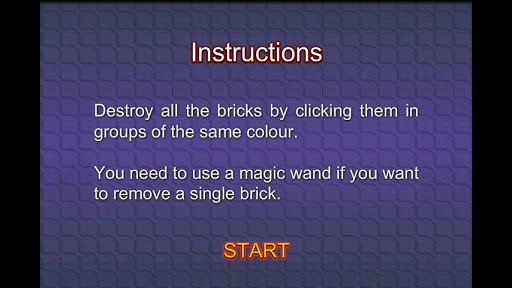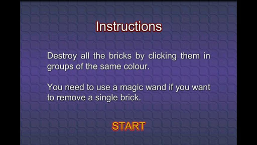 在砖块拆除的游戏有不同颜色的砖块的网格。当你点击一个网格,是所有相同颜色的砖块会断裂,倒塌,造成剩余的砖合并。如果你的游戏有一个单一的砖,这将有助于被删除,使用魔术棒,这将有助于延长你的游戏中找到。当您运行的魔杖时,游戏结束,你不能再通过一组来消灭砖块。这款经典游戏砖块拆除的是一个充满挑战但真棒游戏,以帮助打发时间!
