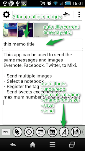 SNS multiple simultaneous transmission (twitter, Facebook, mixi) ■Feature of the paid version only • The position swapping stamp (format tool), show or hide Tag acquisition of Evernote · Delete hash tag on twitter of "#bridgeever" Control the number of the form (up to two free version) infinite ■Sample Twitter) https://twitter.com/trashfeed_dev Facebook) http://www.facebook.com/bridgeever Evernote) https://www.evernote.com/pub/bridgeever/sandbox mixi) http://mixi.jp/show_profile.pl?id=23670329 - Can send multiple images at the same time - Select a notebook - Automatic setting of the title (date, time) - When you have exceeded the maximum number of characters, the ability to automatically send the split (Twitter) - Powerful template feature