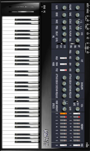 This emulates a 80s classic analogue poly synth, the emulator can be mono, dual or 4 voice polyphony with multitouch. It has single oscillator, noise, lfo, mixer, filter and a pair of envelope generators. The app supports pressure sensitive touch screens, X/Y accelerometer for pitch and mod wheel, multitouch and zooming interface facilities. The interface has options for fat-finger, analogue filters and rich oscillators however these will consume extra CPU cycles. The interface also has a full piano keyboard setting.