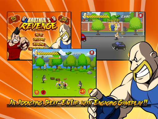 Brothers Revenge is an addicting beat 'em up that pays homage to classic side-scrollers like Streets of Rage, Final Fight and Double Dragon! Play through 9 challenging stages where you'll punch and kick countless enemies, including a tough boss at the end! Use your special attacks like the Power Spin and Earthquake to devastate enemies, or grab over a dozen different objects like trash cans and crates to smash over their heads! Make sure you grab cash to buy upgrade your combos, special moves, and more, all while unlocking new achievements and earning a higher leader-board ranking!
