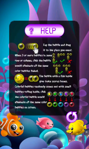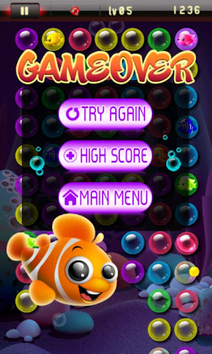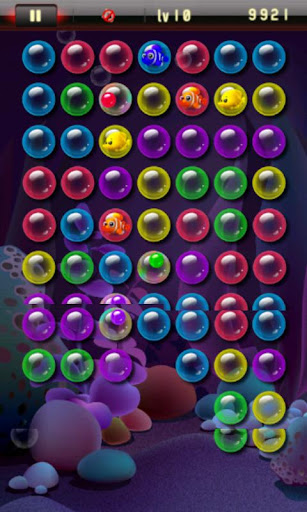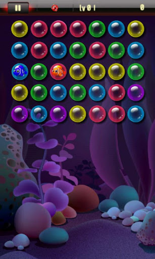 “Bubble Fish” is the classic match three game. If three or more same color bubbles are in same row or column, click the bubble would eliminate the same color bubbles. Eliminate more bubbles in one time would give more scores, the bubbles have fishes in them give twice scores. The colorful bubbles with a small bubble rolling in them would eliminate all the same color bubbles. Bubbles come out faster in higher levels, and after bubbles reach the bottom, you fail. Use your strategy to make more scores and get survived.