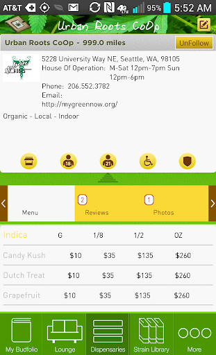 Find local dispensaries – Find and follow legal medical marijuana dispensaries. Users can browse business profiles containing up-to-date menus, photos, dispensary reviews and more!