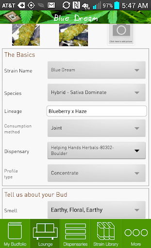 Budfolio allows members to create a personal portfolio (a.k.a. Budfolio) based on their cannabis experiences. Members can capture photos and rate their buds on over 15 various characteristics (i.e. smell, taste, strength, medicinal use, etc.), then share their journal with others.