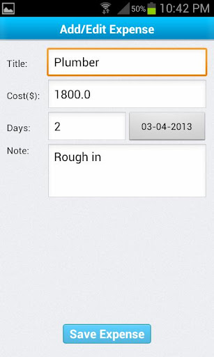 The Builders Cost Tracker app allows the user to set up a list of various job titles and then allocate expenses to each job as they occur. At the top of each page the estimated cost and time allowed for each job can be inserted.