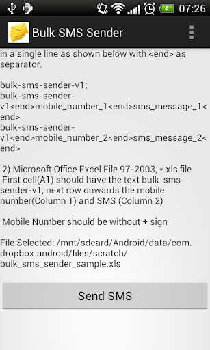 First cell(A1) should have the text bulk-sms-sender-v1, next row onwards the mobile number(Column 1) and SMS (Column 2)