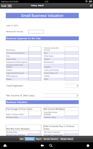 Calculates the business value with respect to four parameters viz, % gross sales, Net Income Multiplier, Monthly Sales Multiplier and Fair Market Values of assets plus % gross sales. Generates the report of valuation by populating the corresponding values from the Small Business Valuation sheet so you can mail it easily.