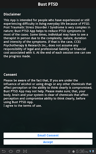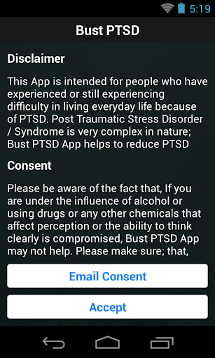 Bust PTSD App is developed by CCEI Psychotherapy & Research Inc. This app is designed to help people and specially Veterans who have experienced Post Traumatic Stress Disorder/Syndrome or living with PTSD Symptoms. Bust PTSD App helps to reduce PTSD symptoms in a cost effective and time efficient manner. The beauty of Bust PTSD App; No Disclosure of Personal Information Required, No Need to Work Around Schedules for Appointment, it's Affordable, Reduces Symptoms and Improves Quality of Life. Bust PTSD App may also help people to deal with Depression, Panic Attacks and Anxiety Issues, because unresolved and untreated PTSD can be a contributing factor in a variety of mental health issues or conditions. Bust PTSD App helps to resolve underlying causes of these conditions and their associated symptoms. Bust PTSD App works on PTSD symptoms at neurological level; this app reduces hyper vigilance, intrusive thoughts and avoidance behaviour in most of the cases, that is a typical PTSD symptoms complex among other symptoms. Bust PTSD App helps to deal with maladaptive and learned behaviour patterns. It lays down the foundation for a healthy, normal and happy life by reprogramming neurological activity patterns in the brain. We wish you good luck for taking a step towards a positive change.