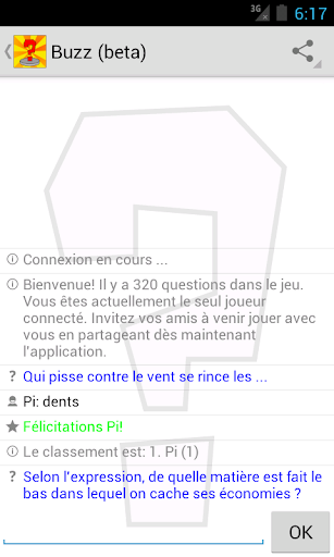 Une fois connecté au serveur de jeu, chaque joueur reçoit la même question est doit donner la bonne réponse avant tous les autres joueurs connectés! Le jeu comporte actuellement 204 questions sur des proverbes et des expressions.