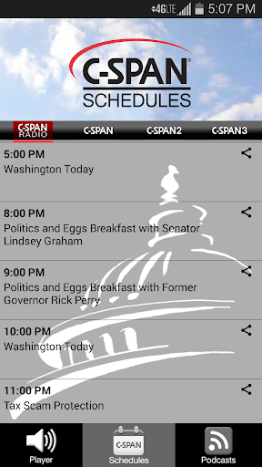 The C-SPAN Radio app delivers live audio streams of commercial-free public affairs programming (C-SPAN Radio, C-SPAN, C-SPAN2 and C-SPAN3) and audio podcasts of some of our regularly scheduled programs around the clock, wherever you are.