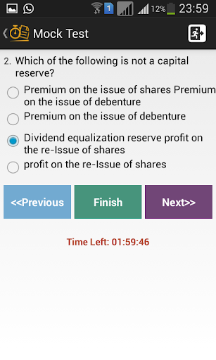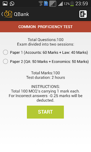 Mock Test would generate a simulated set of similar MCQs as per the CA CPT question format, divided into 2 sessions of 2 hours each. Session 1 would cover Fundamentals of Accounting and Mercantile Laws. Session 2 would cover General Economics and Quantitative Aptitude. Upon expiry of 2 hours the session would automatically terminate and generate a score sheet by awarding +1 point for every correct answer and -0.25 point for every incorrect answer. Users may review questions and correct answers.