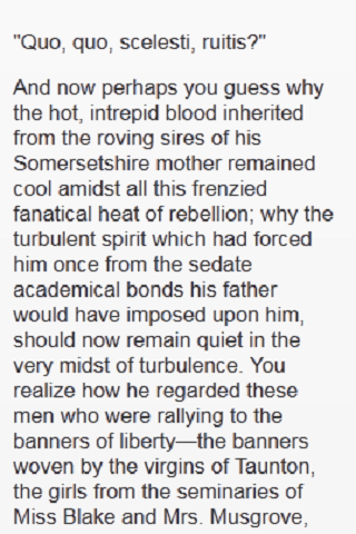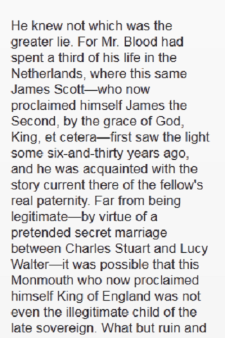 Yet Peter Blood, who was not only able to bear arms, but trained and skilled in their use, who was certainly no coward, and a papist only when it suited him, tended his geraniums and smoked his pipe on that warm July evening as indifferently as if nothing were afoot. One other thing he did. He flung after those war-fevered enthusiasts a line of Horace—a poet for whose work he had early conceived an inordinate affection