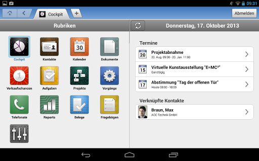 Die App startet mit Ihrem individuellen Cockpit. Anstehende Termine und die damit verknüpften Kontakte, sowie Aufgaben, Vorgänge, Verkaufschancen und Telefonate werden übersichtlich angezeigt. Selbstverständlich können Sie aus dieser Ansicht direkt zu den einzelnen Datensätzen navigieren und diese bearbeiten.