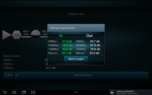 Calculated values for the input signal and output of each component or element in the three main frequencies: 55MHz, 550Mhz, 750Mhz and return.