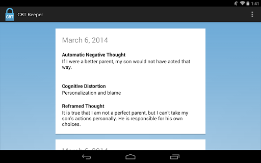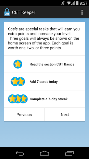 CBT Keeper teaches simple techniques that will help you overcome depression and anxiety. While you learn, you'll rack up points, achieve goals, and level-up to keep yourself motivated until you become happier and healthier. The principles taught in this app are based upon cognitive behavioral therapy (CBT), a proven treatment for depression and anxiety.