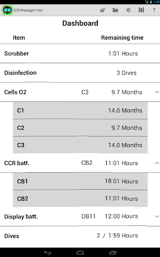 CCR manager allows following up in time the components of your rebreather. CCR Manager monitors the usage of the components of your rebreather and helps you managing efficient replacements safely.