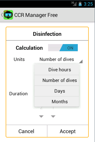 You can choose to calculate by hours of dive, by number of dives, by days or months. The calculation maybe activated or deactivated by element.