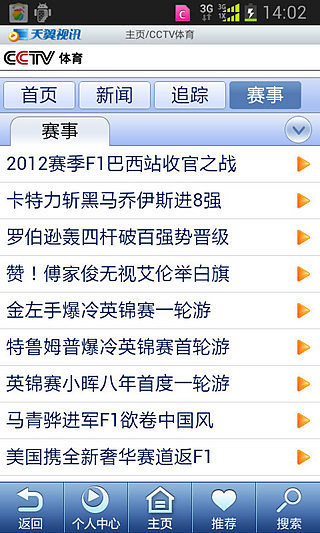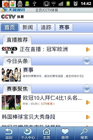 拥有世界众多顶级赛事国内独家报道权的专业体育频道,足球,篮球,网球,赛车,高尔夫,斯诺克,乒乓球包罗万象,国内外重大赛事的现场直播,体育热点问题追踪报道一网打尽!