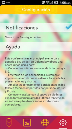 Conozca toda la información de la XVI Conferencia Colombiana de Usuarios Esri, que se realizará del 26 al 29 de Agosto en el Hotel Cosmos 100. En esta aplicación encontrará una guía completa del hotel y sus alrededores, la agenda del evento y acceso directo al Planeta Esri, un espacio de ideas y aplicaciones innovadoras del mundo SIG.