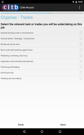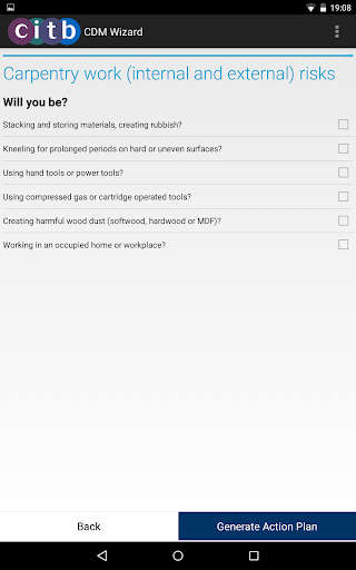 The app asks you questions about what you will be doing and the nature of the work. Most of the questions are answered with simple tick-boxes, allowing you to complete the whole process in less than 5 minutes. An action plan is then generated that can be viewed instantly on your device or can be emailed to whoever needs it. This is the Construction Phase Plan for your job and required under CDM 2015. The plan includes: