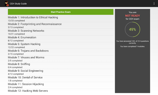 CEH Study Guide is packed with hundreds of questions, revision content, practical real-world lab exercises, and external resources, split over 20 modules. This will be the most useful app to prepare for the EC Councils Certified Ethical Hacker examination V8.