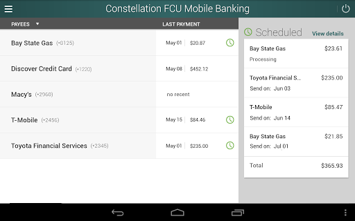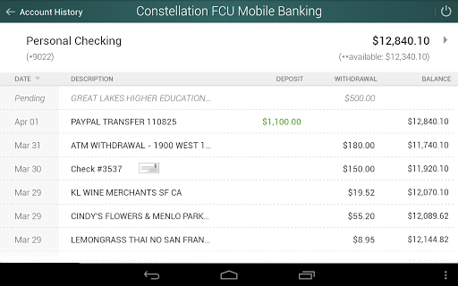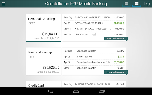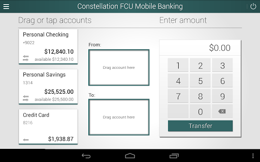 With Constellation FCU's Mobile Banking app, you can check your available balances, view transaction history, transfer funds between accounts, pay your bills, view and activate your cash back offers, view our rates, contact us, and even find a local ATM or Shared Branch. With Constellation FCU's Mobile Banking app, you can have anytime, anywhere access to your accounts.