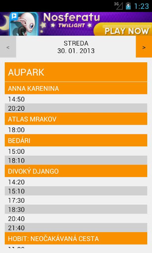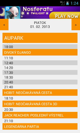 Jednotlivé časy premietania sú prehľadne rozdelené podľa miesta premietania (Aupark, Eurovea, Polus), následne podľa dní a samozrejme podľa názvov filmov pekne abecedne a chronologicky.