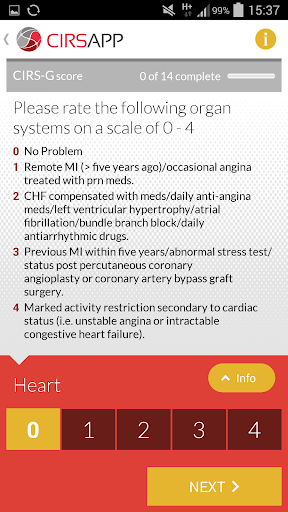 The CIRS App is an interactive tool to measure comorbidity. It was developed to provide healthcare professionals with information on the 'Cumulative Illness Rating Scale for Geriatrics' (commonly abbreviated to CIRS-G), and to help them calculate a patient's biological fitness based on a ratified CIRS-G scoring assessment. The app is for guidance only, does not replace expert medical opinion and is not deemed to be a medical device within the terms of the Medical Devices Directive 93/42/EEC.