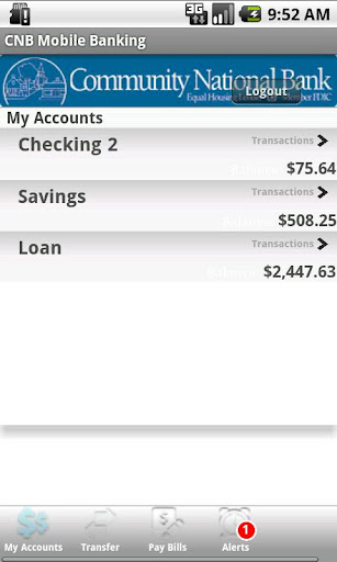 CNB Mobile Banking is a mobile banking solution that allows you to access your Community National Bank accounts using your Android phone. CNB Mobile Banking is a service that allows you to view your account balances, latest transactions, transfer funds from one CNB account to another, pay bills and locate the nearest CNB branch or ATM using their Android Phone.