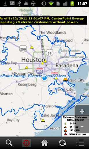 The CenterPoint Energy Electric Mobile Outage Tracker provides approximate locations of current outages within Houston area on the map. Estimated outage locations are displayed as triangles. Colors correspond to the number of customers estimated to be without power in the vicinity of the triangle.