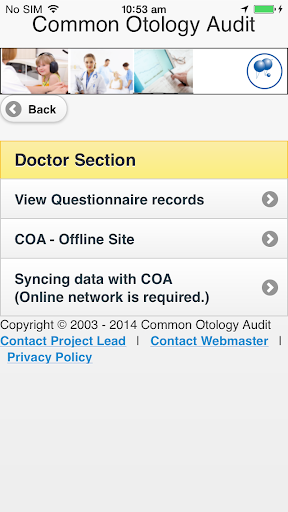 The Common Otology Audit Group has maintained an award-winning web site (“COA”) at http://www.ear-audit.net to collect clinical data for study and comparison since 00’s. With the Mobile Device technology becoming more mature there has been calls to extend the service to users who worked at different clinics and might not have access to the internet at the time of data capturing. Moreover, to facilitate better understanding of patient’s condition a questionnaire is designed to be completed by the patient just before the appointment and will be reviewed by the user at the beginning of each appointment. The questionnaire will be stored on the database for future reference by the user via the COA web site.