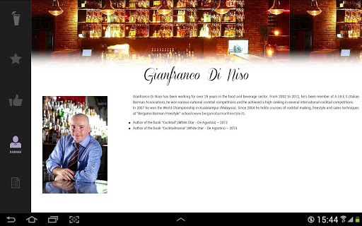 雞尾酒學院是一個應用程序在英語 雞尾酒學院,第一家專業視頻指南雞尾酒。 調酒學院是國內第一家專業的應用程序創建的雞尾酒。有史以來最完整的,也是唯一一個提供視頻解釋。 該應用程序已被設計為一個全球性分佈,它是其實在英語和意大利語。 創建一個應用程序的那些人喜歡把雞尾酒的業餘水平,無論是對那些在同行業中工作的人。目前在APA視頻質量,是一種有效的教學工具。 APP有110雞尾酒,選擇您的最愛,他們在社交網絡上分享的能力。卡內的每個雞尾酒列出的必要成分,卡路里和酒精含量。配方和一步一步的視頻,顯示還有一個簡短的文字。 這項研究分為雞尾酒: - 按字母 - 基地(杜松子酒,朗姆酒等)。 - 酒精 - 卡路里 在應用程序中也有一個卡與酒保世界冠軍詹弗蘭科·迪南翔雞尾酒的傳記。 的APP 創建由Cinehollywood SRL(www.cinehollywood.biz),與:詹弗蘭科·迪南翔(www.gianfrancodiniso.it)合作,實現由公司 ItaliaMultimedia(www.italiamultimedia.com)