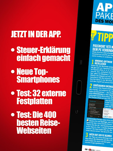 COMPUTER BILD als App - das heißt Europas größte Computerzeitschrift gibt es jetzt auch in einer Version mit integrierten Videos, voll zoombaren Seiten und so schnell, wie nie zuvor: In der App steht ab sofort jedes Heft einen Tag vor dem Erscheinungstermin um 22 Uhr für Sie zum Download bereit.