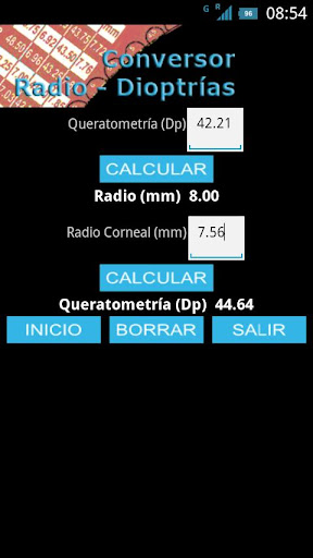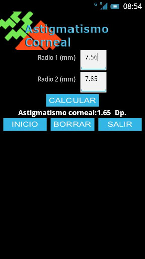 - "Astigmatismo Corneal" calcula el astigmatismo corneal a partir de los radios queratométricos.