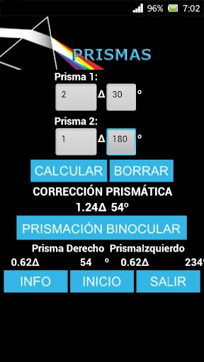 - "Prismas" combina 2 prismas oblicuos situados en un solo ojo para dar el prisma resultante en potencia y orientación.
