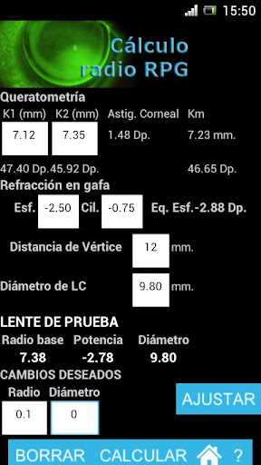 - "Cálculo Radio RPG" determina el radio base de la 1ª lente de contacto RPG de prueba para la adaptación de lentes de contacto rígidas permeables al gas, según la potencia, astigmatismo y queratometría.