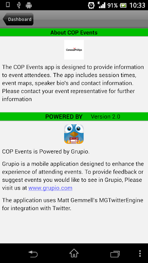 The COP Events app is designed to provide information to event attendees. The app includes session times, event maps, speaker bio’s and contact information. Please contact your event representative for further information.