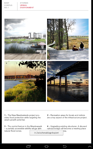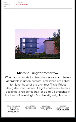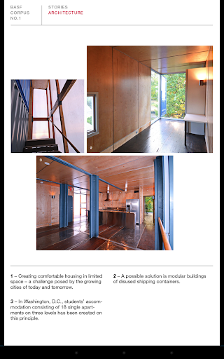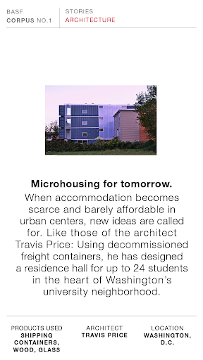 How will demographic change and the rapid growth of cities impact the architecture of tomorrow? How can ecological and urban planning challenges be mastered with the aid of new high-performance materials? Interdisciplinary work on possible responses to these and other important issues is presented interactively in CORPUS. Some of these approaches are embodied in BASF high-performance products for the construction sector, and the magazine graphically depicts and explains their characteristics and possible applications. CORPUS is appearing quarterly.